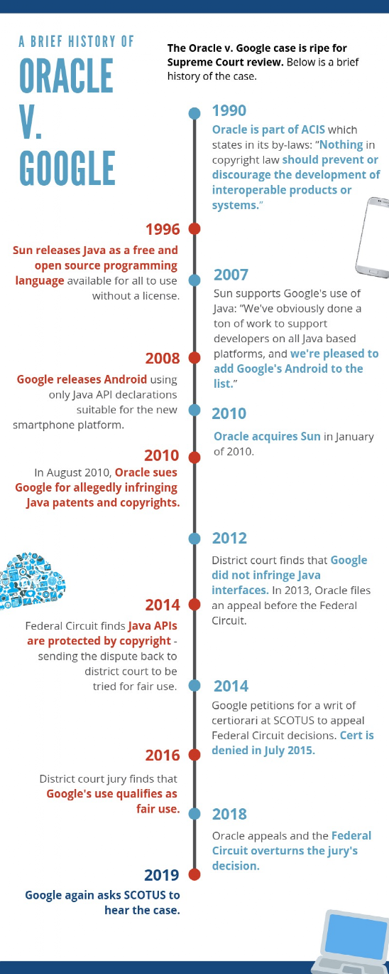 2018年:甲骨文公司提出上诉,联邦上诉法院推翻了这一决定,裁定谷歌确实侵犯了甲骨文的商标;这一决定将把案件发回加州法院,以确定谷歌的母公司Alphabet将欠甲骨文多少钱。