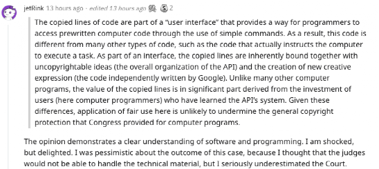 「多数人打算将声明代码是否可享有版权的问题留待日后再讨论,」托马斯补充说,「这样做的唯一明显原因是,多数人无法将其有根本性缺陷的合理使用分析与宣布代码可享有版权的结论对号入座。」