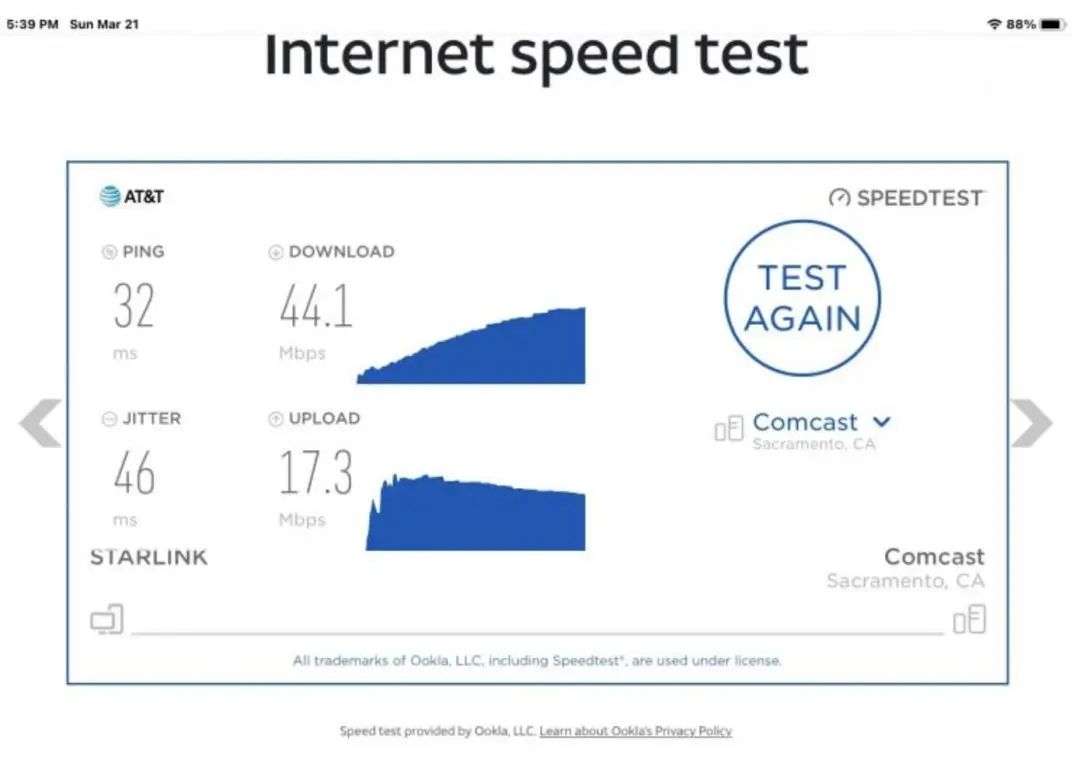 根据外媒 Wccftech 的报道,Starlink 目前已经被美国各地用户所注册,并且其表现明显优于竞争对手 HughesNet 和 Viasat。根据部分用户的实际测试,Starlink 在美国加利福尼亚州索诺玛县的测试数据显示其最低下载速度为 44Mbps,最高突破了 200Mbps(所有测试都是在 Apple iPad Mini 上进行的,可参考 4G 网络的下行速率基本可以达到 100Mbps~150Mbps)。