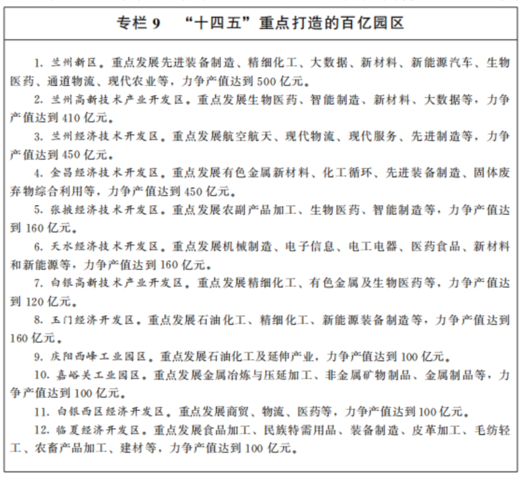 甘肃规划纲要也提出,改造提升传统产业、发展壮大新兴产业、积极谋划未来产业、培育千亿产业集群、打造百亿园区。