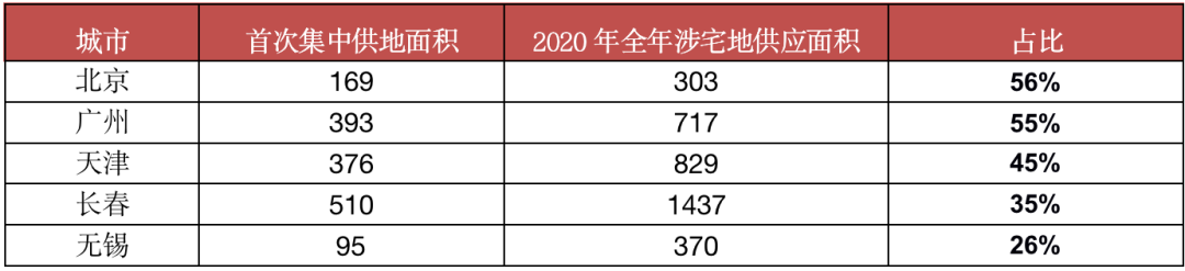 注:截止3月31日,长春、广州、无锡、天津和北京5个城市正式发布首批集中出让公告,上海、杭州、南京等仅发布预公告的城市未在统计之列。