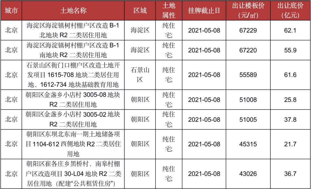 其中,北京起拍单价超过3万元/平方米的地块有16宗之多,分别位于海淀、朝阳、昌平、大兴、丰台和石景山区,其中一度因“竞地价、竞政府持有商品住宅产权份额、竞高标准商品住宅建设方案”的挂牌出让方式引发社会热议,并被中止出让的两宗海淀区树村地块也在首次集中挂牌之列。