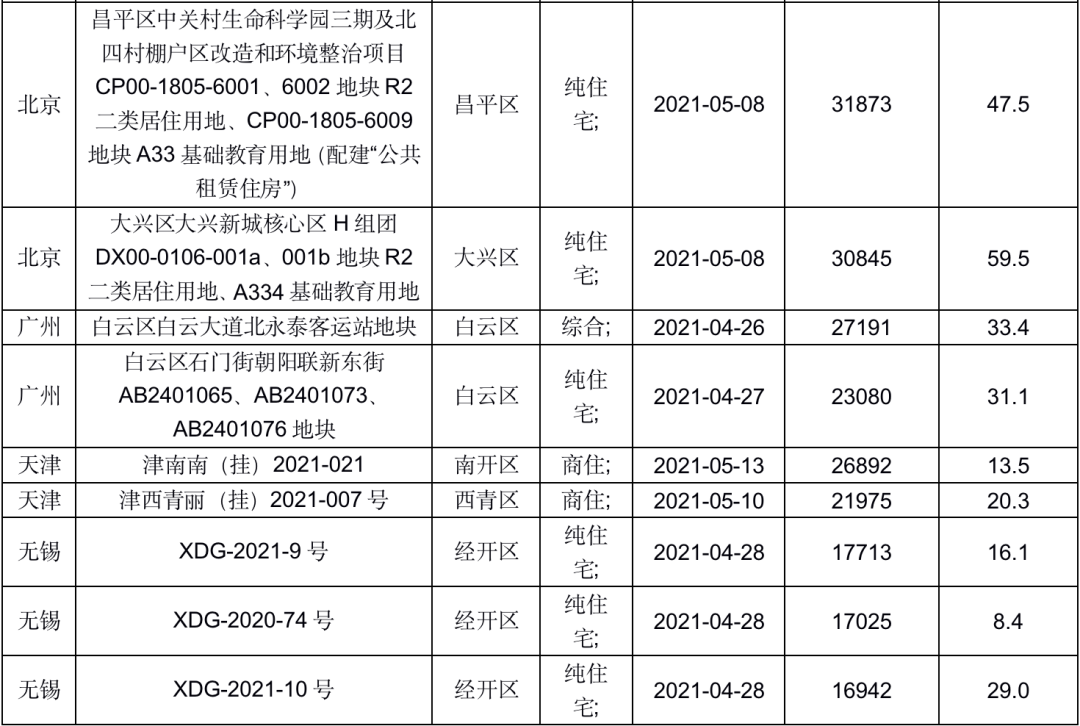 我们认为,接下来的土拍焦点将集中在北京、广州、天津、无锡、绍兴、义乌、温州等城市;尤其是北京,起拍价超过3万元/平方米的土地就有16宗之多,其中不乏海淀树村、金盏乡小店村这种起拍价超过5万/平方米的优质地块,未来土拍热度也或将在这些优质地块的带领下显著升温。