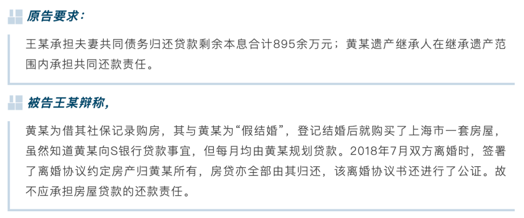 2017年7月至2019年11月,黄某每月都按时归还房贷。然而2019年12月15日,黄某死亡,此后便无人继续偿还房屋贷款。2020年12月,S银行向法院提出金融借款诉讼,并将此前与黄某“假结婚”的王某作为第一被告。