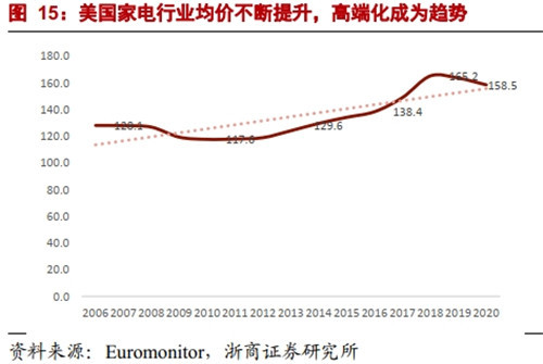以海尔智家最大的北美市场为例,近年来美国家电均价不断提升,2006-2020年从128美元提升至159美元。