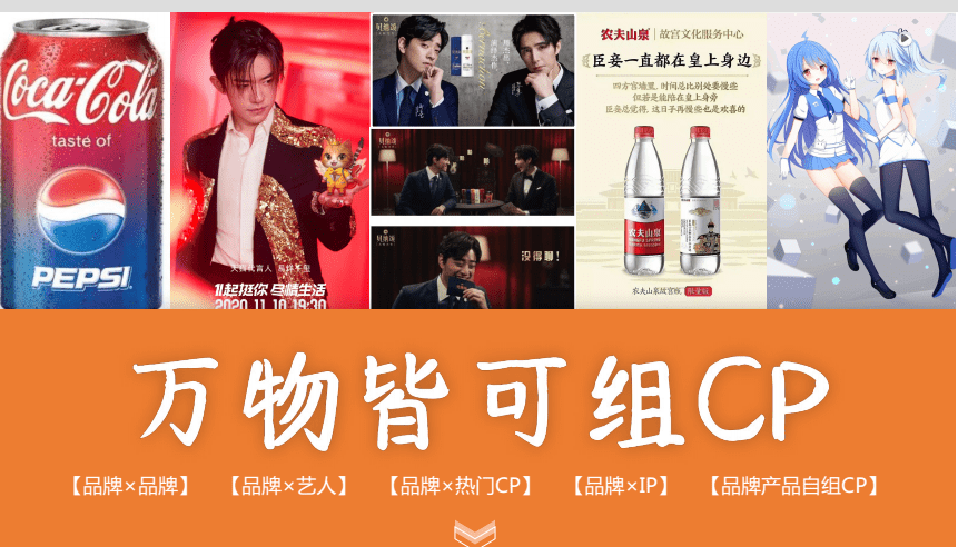 另一方面,品牌们的CP圈层营销无论是在形式上,还是噱头上的花样都只增不减,就目前看来,品牌CP组合渠道高达5种。例如品牌X艺人,品牌X品牌,品牌X热门CP,品牌X IP以及品牌矩阵内产品自行CP。