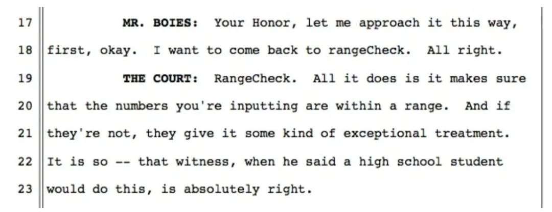 在 2012 年 5 月 18 日,加州北区的 William H. Alsup 法官主持的一次庭审中,争议焦点集中在一个名为 rangeCheck 的函数上。在甲骨文测试的共计 1500 万行代码中,只有这一部分是「逐字逐句」抄袭的,甲骨文律师采取鼓吹该函数重要性的策略试图证明谷歌的抄袭。为了验证甲骨文提出的可能性,Alsup 法官甚至亲自上手尝试写代码。