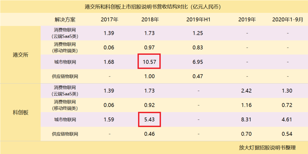 究其原因,是其核心业务“城市物联网解决方案”的收入数据有问题。港股招股书显示,该业务线在2018年收入为10.57亿元,到科创板数据却就变成了5.43亿元。单此一项就有5亿多糊涂账。