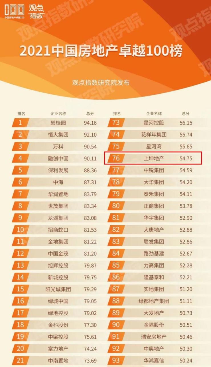乘风破浪,上坤入围2021中国房地产卓越100