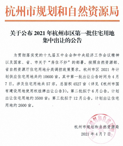 4月7日0点左右,杭州市规划和自然资源局发布消息,为贯彻落实党的十九届五中全会和中央经济工作会议精神以及国家、省、市关于“房住不炒”的部署,按照自然资源部、省自然资源厅住宅用地分类调控政策要求,杭州市区2021年共计划供应住宅用地共约10600亩,其中第一批出让公告时间为4月7日,涉及住宅用地共57宗,总面积4527亩。