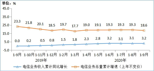 图聽聽2019-2020年1-9月电信业务收入和电信业务总量累计增速