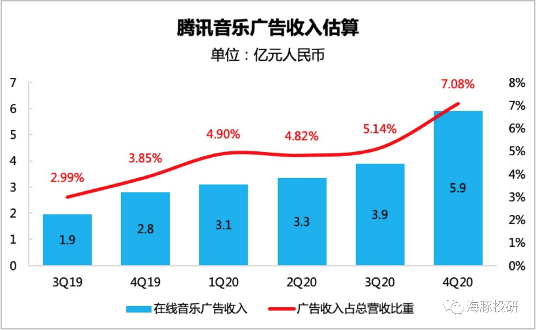 而腾讯音乐目前广告收入占比较小,若按照管理层电话会透露广告收入大约占在线音乐非订阅收入的50%来估算,Q4广告收入占总营收比重仅为7%左右。