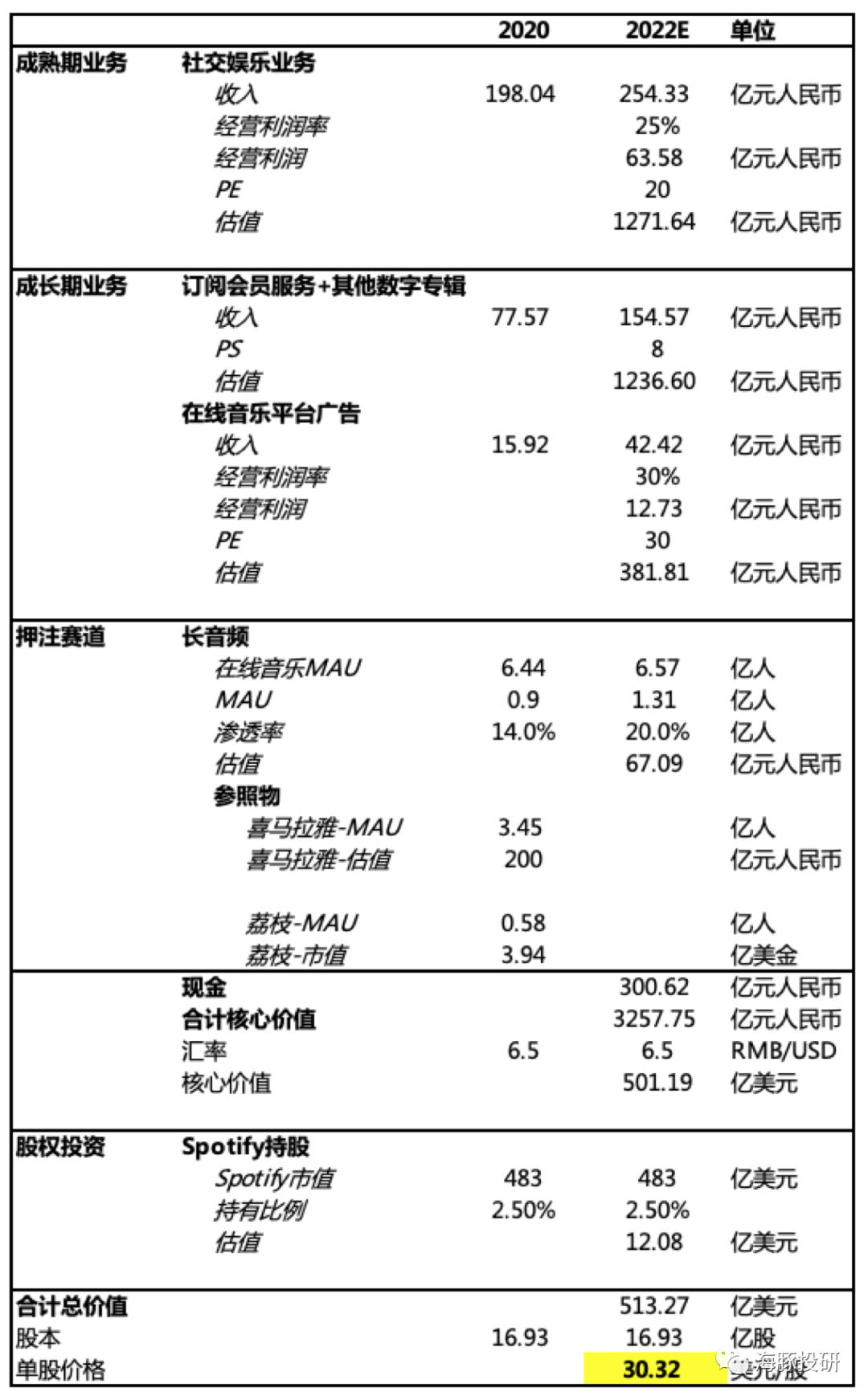 因此为了判断短期内腾讯音乐按照成长股的价值空间能达到多少,我又按照SOTP分部估值法来做一下对比。