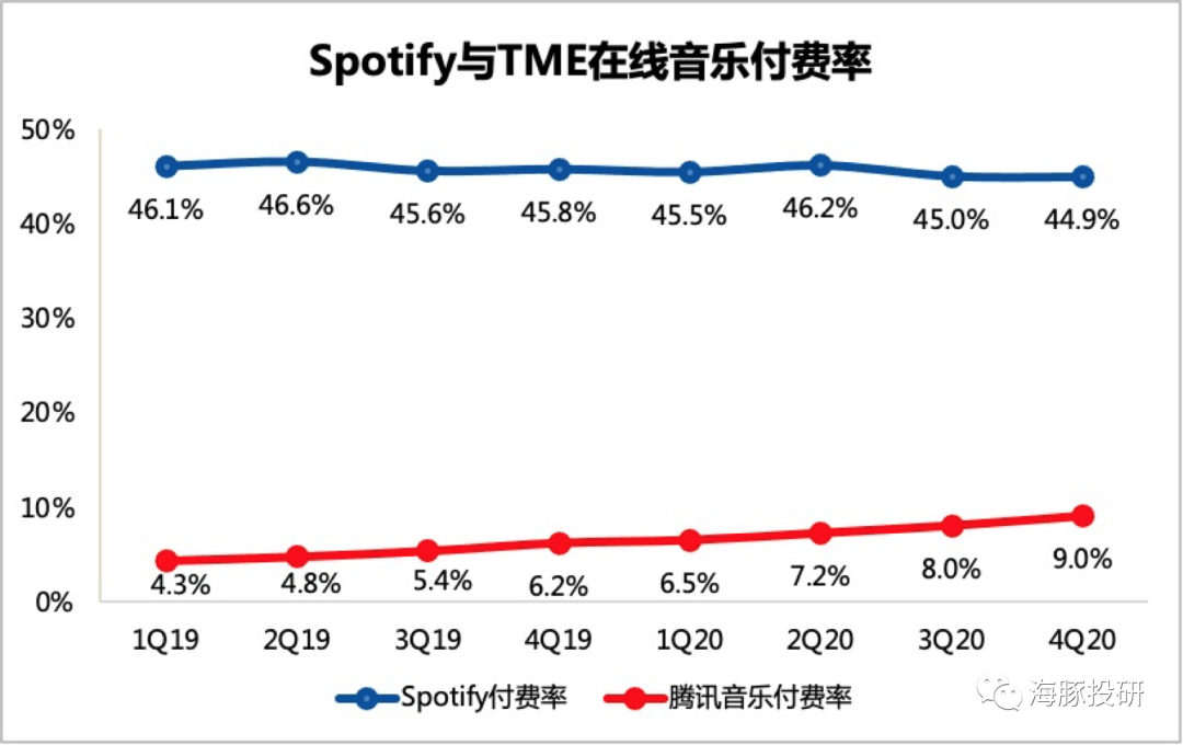 去年四季度,腾讯音乐的在线音乐付费用户规模仅为5500万,相比于6.31亿的用户大盘,渗透率区区9%。
