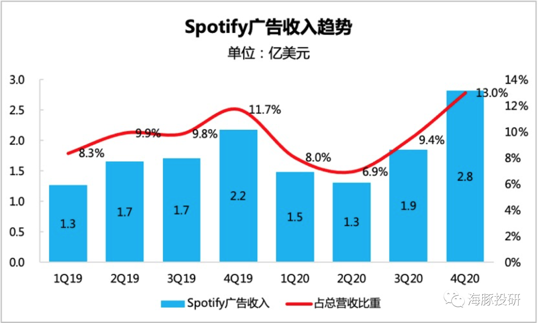 这一点Spotify也早就给腾讯音乐做出了榜样:2020年四季度,Spotify的总营收中,有13%来自于广告收入,广告形式包括:Banner位广告、音频广告、播客广告、推荐歌单等。