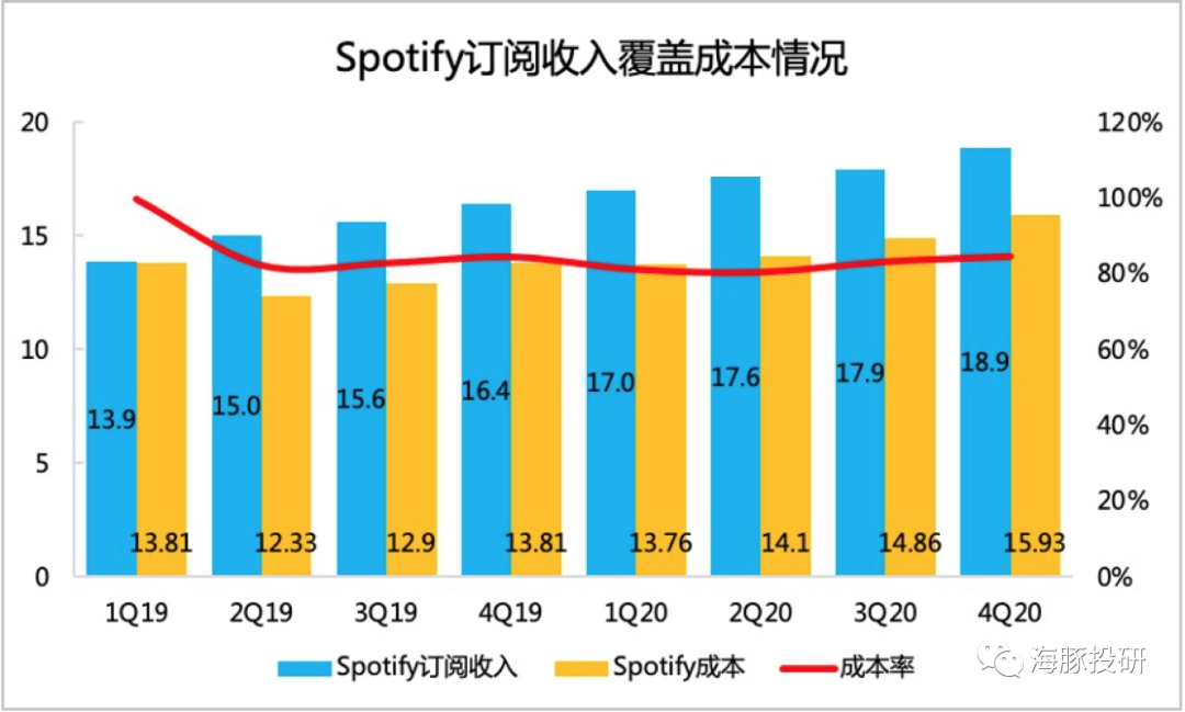 还是拿Spotify做例,尽管Spotify的付费率已经让国内音乐平台垂涎不已,但单靠付费会员收入,Spotify显然也无法覆盖住全部的成本和费用,光成本就已占到订阅收入的80%以上。