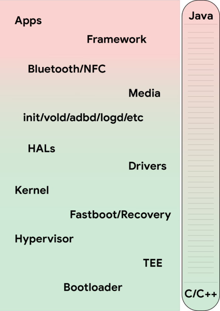 C和C++构成了Android平台上数千万行代码,这使得一旦发生内存安全漏洞,就形成最难以解决的代码错误来源,占Android高严重度安全漏洞的70%左右。所以与其事后再解决这些Bug,不如从一开始就预防。