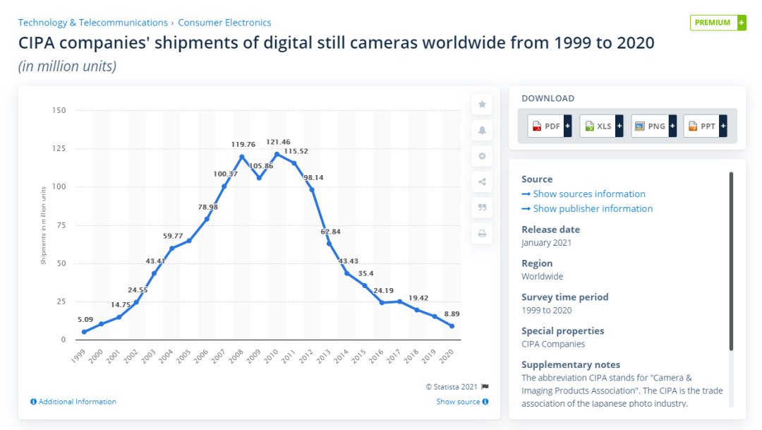 恰恰相反,虽然拍照手机的销量很早就超过了数码相机,但并未挤压相机的原有市场,二者反而呈现出一种相辅相成的关系:自1999年首部拍照手机诞生,相机的销量就逐年增长,在2010年达到了年销量1.21亿部的顶峰。