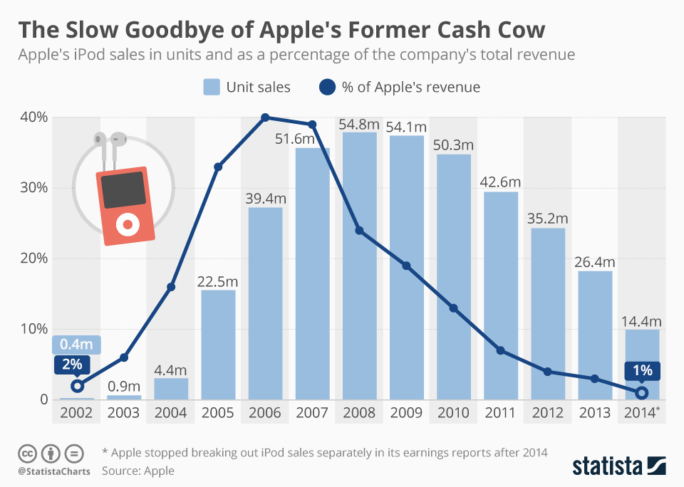 与相机类似发展曲线的还有便携式音乐播放器,也就是大家常说的MP3,21世纪初,在互联网的驱动下,iPod这类数字播放器快速取代了以往的随声听,成为普罗大众的选择,青年男女无不以一款揣在口袋里的MP3为傲。