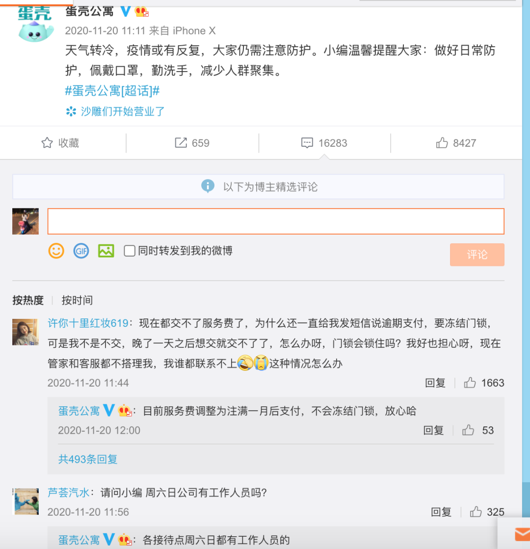 自2020年11月5日起,“蛋壳公寓”的官方微信公众号就再也没更新过;11月20日后,官方微博也没有再更新。最后一条微博等评论列表上,都是经博主筛选展示后的当日评论,有人说“如果你熬过来,我还继续租你”,更多的是“来自年费用户的每日一看”的自嘲式调侃。