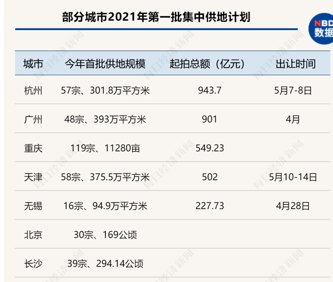 4月7日凌晨,杭州57宗涉宅块集体挂牌,总出让面积301.8万平方米,总起拍价943.7亿元;同日,重庆发布今年第一批次宅地出让公告,共供应119宗宅地,共计约11280亩,总起始价549.23亿元。而不久前,北京、天津、广州、无锡、长沙等城市已经公布了今年第一批集中供地计划。