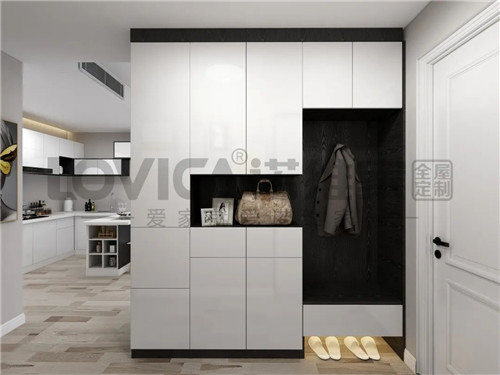 进门放置一个入户柜,既能够增加收纳的空间,又起到了把客厅分离起来的作用,增加了房子的层次感。半开放式的柜子还满足了挂衣服和收纳鞋子的需求。