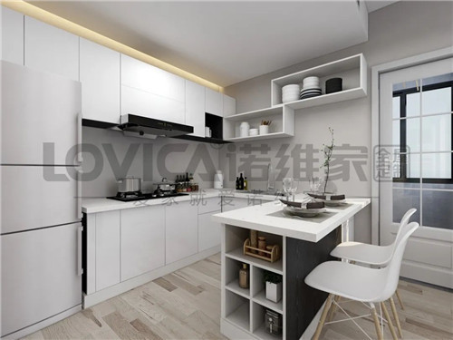 地柜+吊柜的设计让厨房看起来简洁大气,L字型的厨房延伸一侧作为餐桌,在做饭时可以互相交流,增加下厨的乐趣。餐桌上放置一颗绿植,清新之感扑面而来。