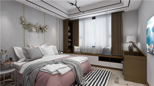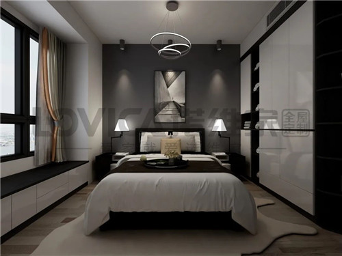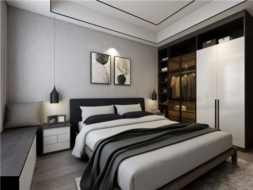 卧室的设计虽然简洁但却十分温馨。简约时尚的床头挂画和吊灯,搭配两边对称的床头灯,带来强烈的视觉体验,再结合到顶式的衣柜,美观又实用,大大提升了房间的质感。