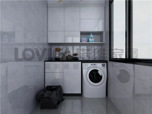 靠墙而设的柜子把阳台的清洁用品和工具都收藏起来,把洗衣机嵌于其中,将空间利用的恰到好处,看起来简洁又干净。