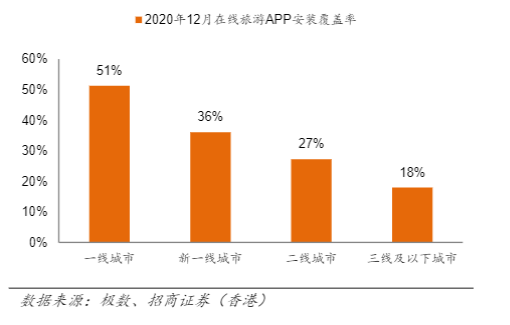 这实际上从侧面催活了三四线城市的旅游市场。据“招商证券(香港)”整理的数据显示,低线城市的在线旅游渗透率并不高,三线及以下城市的在线旅游APP安装覆盖率仅18%,未来还有较大的增量空间。