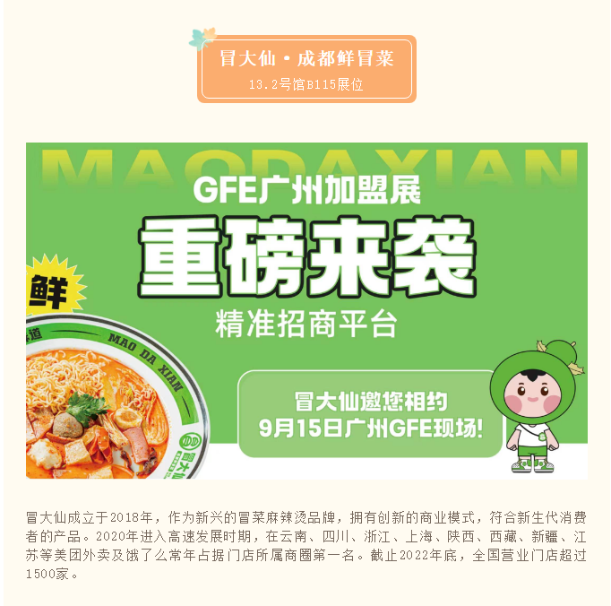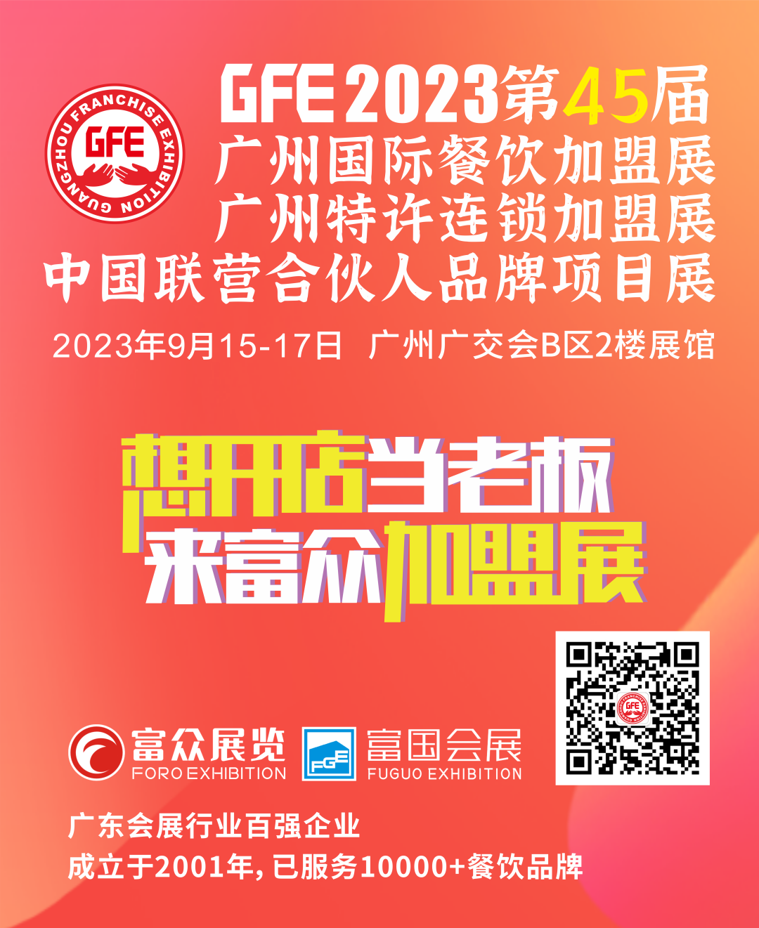 2023我们一同前行,9月15-17日与您相约广州•琶洲广交会展馆B区2楼4大展馆,这里有您想要的创业投资交流平台。时刻把握创业加盟黄金期,快来第45届GFE2023年广州加盟展!