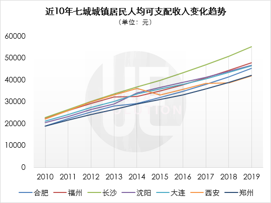 在此情形下,居民的购买力将对城市消费发展产生更大影响。比较过去十年的城镇居民人均可支配收入,西安逐年落后,并最终从7市第二下降至末尾;相比之下,长沙则连续多年保持领先地位。