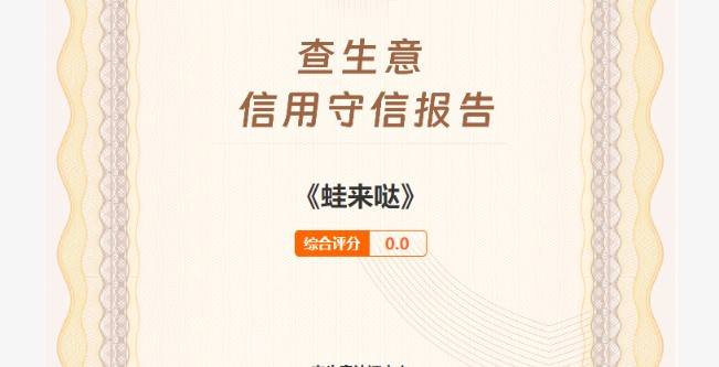 提示:蛙来哒在查生意平台查询,项目信息,资质信息未提供,综合加盟评分为1.8,加盟需谨慎。全面考虑之后,确保自己对品牌有足够了解,以最大程度地降低创业风险。