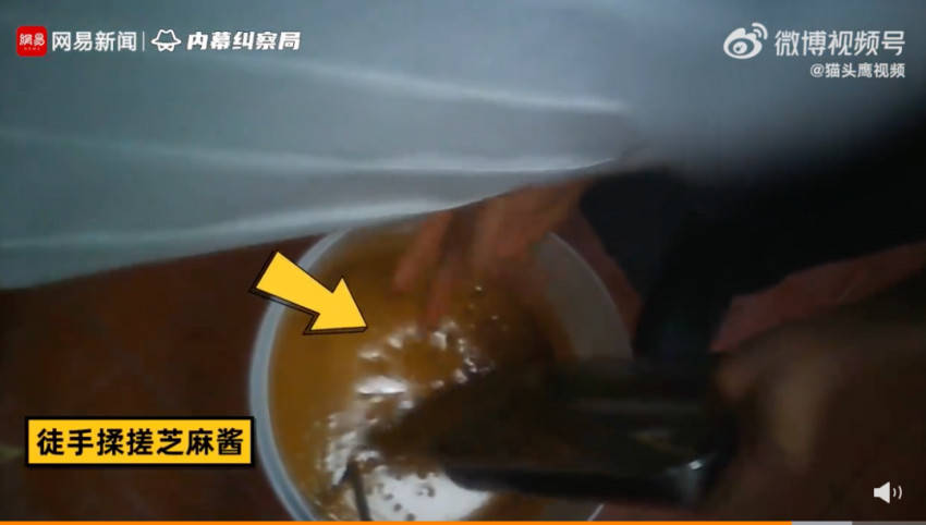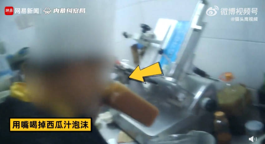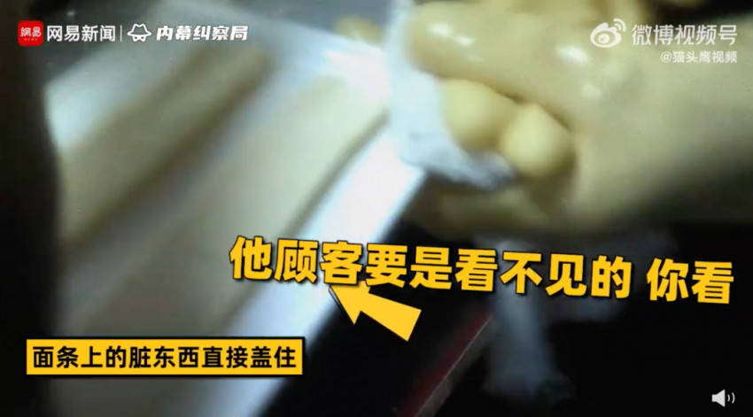 视频中,后厨员工用手“搓”麻酱、用嘴喝掉西瓜汁的浮沫,面条有黑点就翻个面掩盖。厨师干了4个月,连健康证都没有。