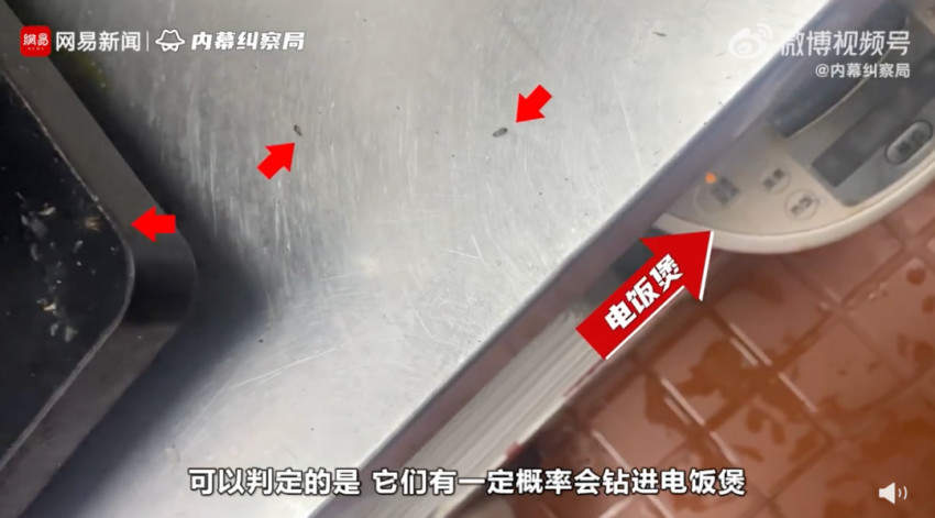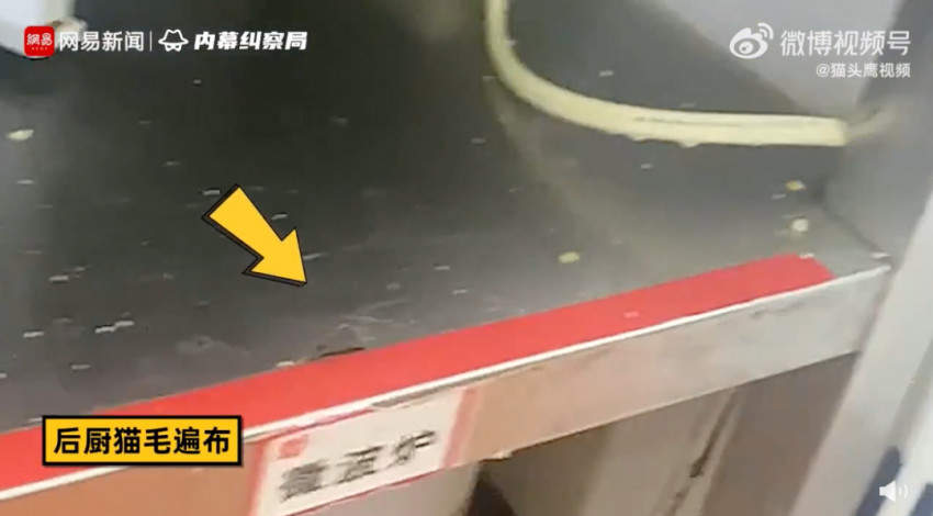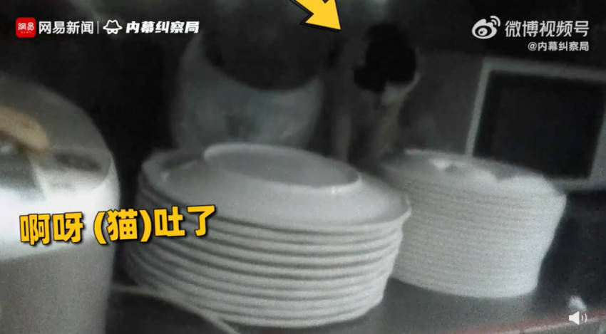 视频还显示,该店后厨不仅猫毛遍布,在电饭煲附近还有小虫子四处爬,猫猫也在橱柜里呕吐。