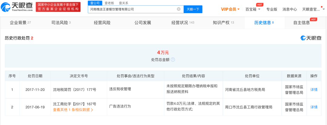 天眼查显示,此次被爆的槐店王婆大虾关联公司为河南槐店王婆餐饮管理有限公司,该公司目前有2条历史行政处罚信息,违法行为类型分别为违反税收管理、广告违法行为,2次处罚总金额为4万元。
