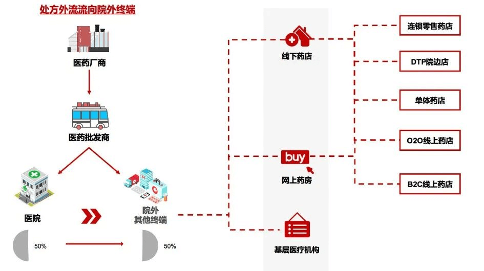 基于医院端、渠道端进行处方外流测算,我国处方外流市场总规模近3,000亿元,年均外流400-700亿元。而处方外流流向,主要是由院内转向线上或线下的院外终端。
