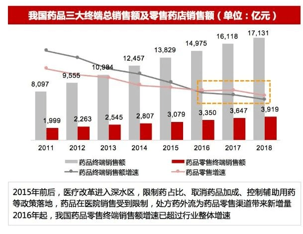 2015年前后,受医疗改革影响,药品在医院端销售受到限制,处方药外流为药品零售渠道带来新增量。自2016年起,我国药品零售终端销售额增速已超过行业整体增速。2018年,药品零售渠道实现销售额3,919亿元,占比22.9%,其中实体药店实现销售额3,820亿元,占比22%,网上药店实现销售额99亿元,占比1%。