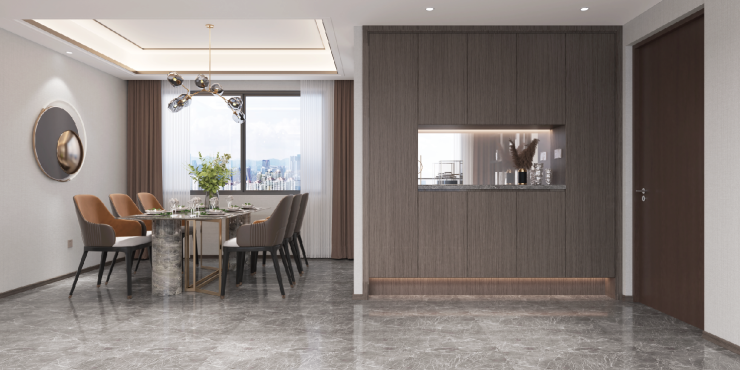 在天汇,日立的中央空调、威能的地暖和百朗新风系统,龙头、花洒用的是有“厨浴界的爱马仕”之称的德国品牌汉斯格雅;马桶则用的是号称“卫浴届的劳斯莱斯”的杜拉维特。甚至还有几个惊喜彩蛋,如玛雅灰石材的餐客厅全铺装、皮革硬包主卧背景墙、陶瓷大板客厅背景墙、直饮过滤净水器等等,超越了许多购房者的期待。