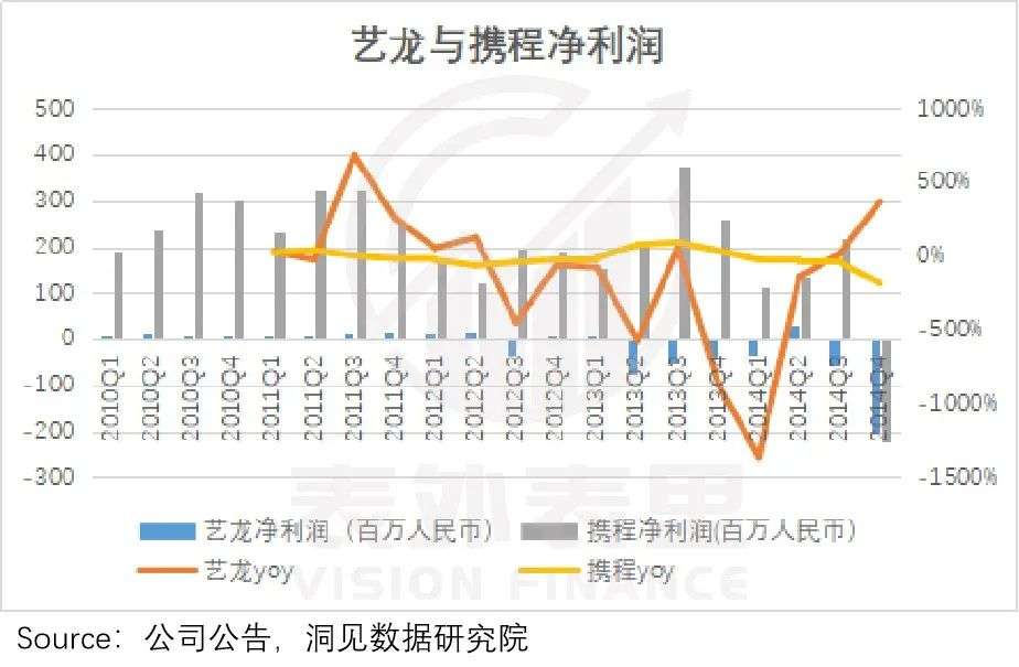 近身互撕下,两家业绩“流血”严重。携程的利润连着三个季度下滑,艺龙更是连续5个季度出现亏损。