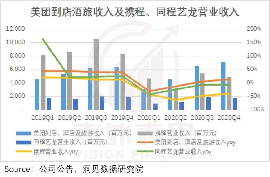 财报显示,2020Q3、Q4美团酒旅营收恢复正增长,而携程、同程艺龙仍旧负增长区,甚至携程的营收下滑40%左右。