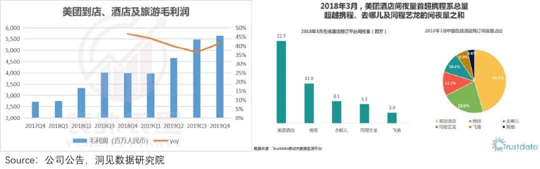 数据显示,截至2019Q4,美团的到店酒店业务毛利润提升一个台阶。同时,2018年3月,美团酒店间夜量也首超携程系间夜量之和。