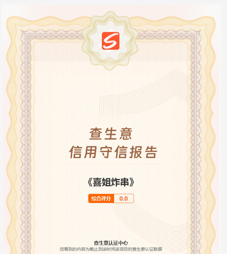 提示:喜姐炸串在查生意查询,项目信息,资质信息未提供,综合加盟评分为1.87,加盟需谨慎。全面考虑之后,确保自己对品牌有足够了解,以最大程度地降低创业风险。