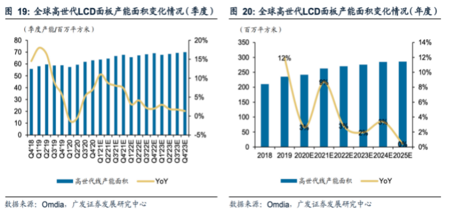 根据Omdia数据,2021年高世代LCD 面板产能同比增幅预计在9%左右,2022年增幅仅有3%,2023年增幅仅有2%。未来随着大规模投资基本结束,海外落后产能退出,增速将维持在3%以下。