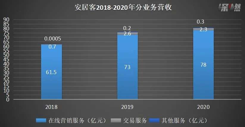 其他两大业务之于安居客的贡献度可谓是少之又少,其中的交易服务,是安居客名义上的第二大收入来源,但在过去三年营收占比仅为1%、3.5%、2.8%。这部分收入主要来自于“爱房”相关业务中从开发商处赚取的新盘销售佣金。2020年,安居客交易服务收入为2.28亿元,其中2.01亿元由旗下新房交易平台爱房产生。