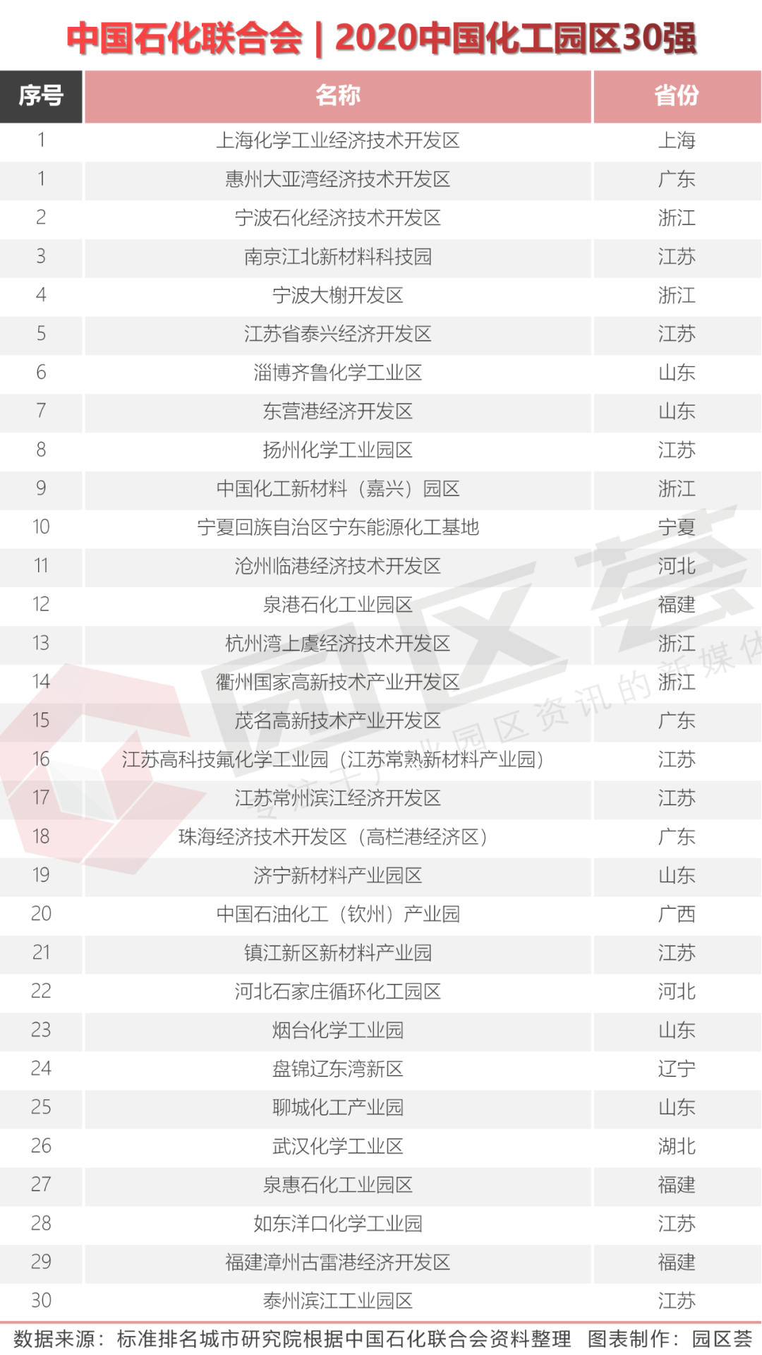 在30强化工园榜单中,上海化学工业经济技术开发区和惠州大亚湾经济技术开发区并列第一。