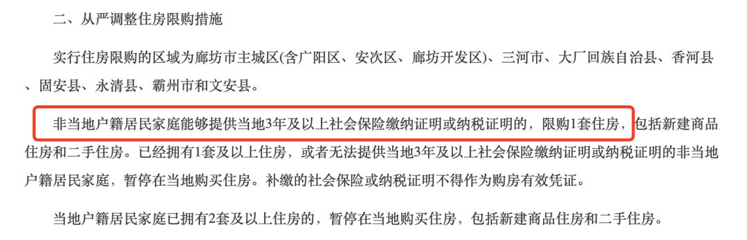 不过所有的疯狂都在2017年6月2日戛然而止。当日,廊坊传言已久的限购政策尘埃落定。《关于进一步促进全市房地产市场平稳健康发展的实施意见》指出,非本地户籍购房者有当地3年及以上社保或纳税证明的,限购1套住房;本地户籍居民已经拥有两套及以上住房的,暂停在当地购买住房。
