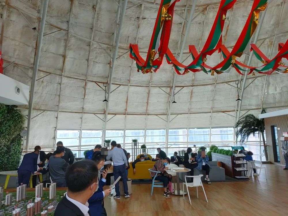 项目的沙盘、讲解等位置被安排在售楼处二层,记者到访时已经人满为患,看房的是一队,坐在旁边沟通价格的是一队,甚至付款也在排队,现场工作人员有些疲于应付。售楼处是一座穹顶式建筑,特殊的结构又放大了这里的嘈杂效果,身处其中,就像来到了菜市场。