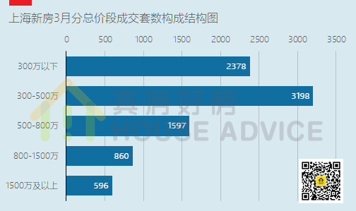 根据3月分总价段成交套数构成结构图来看,500万以下的成交套数占总成交套数的65%,800万以上的更是占据了83%。