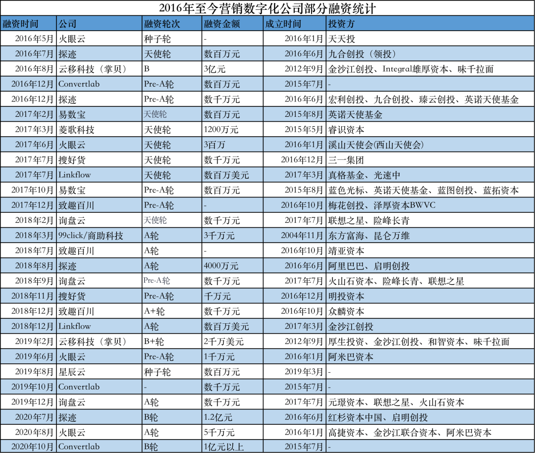此外,第一新声统计,从2016年至今,不少营销数字化相关企业获得融资,其中火眼云获得4轮,致趣百川、Convertlab、探迹、询盘云获得3轮。从企业成立时间来看,营销数字化的新锐企业在市场中实现快速成长。